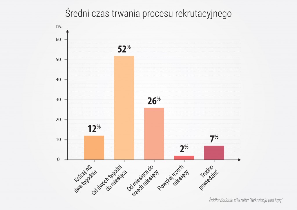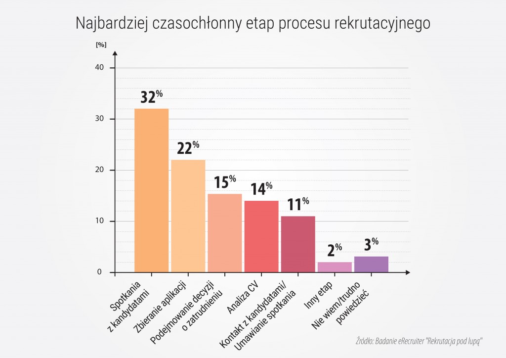 Jeśli ktoś nie wierzy, odsyłam do raportu eRecruiter, z którego wynika, że połowa rekrutacji w Polsce trwa do miesiąca, a 1/4 nawet 3 razy dłużej. Dla 32% ankietowanych najbardziej czasochłonnym procesem rekrutacji są… spotkania z kandydatami. Na drugim miejscu podium uplasował się spływ aplikacji (22%), a w opinii 15% rekruterów najwięcej czasu zajmuje w ich firmie podejmowanie decyzji o zatrudnieniu, np. przez bezpośrednich przełożonych.