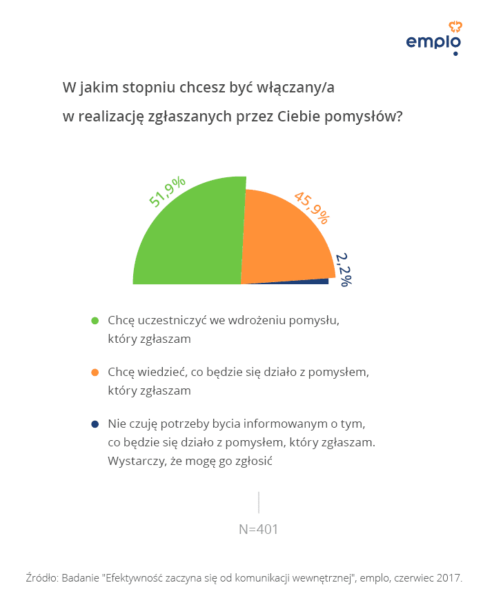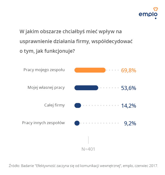 Co to oznacza? Prawie 70% chce współdecydować o pracy swojego zespołu, 54% o ich własnej pracy, a 14% o pracy całej firmy. Połowa pracowników przyznaje, że w sytuacji, w której zgłasza swój pomysł do realizacji, chce być włączona w jego realizację.