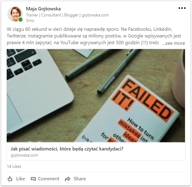 Za każdy razem, kiedy publikujecie coś na LinkedIn (niezależnie od tego czy jest to post tekstowy, link czy zdjęcie), bot serwisu automatycznie oznacza Waszą treść jako:
