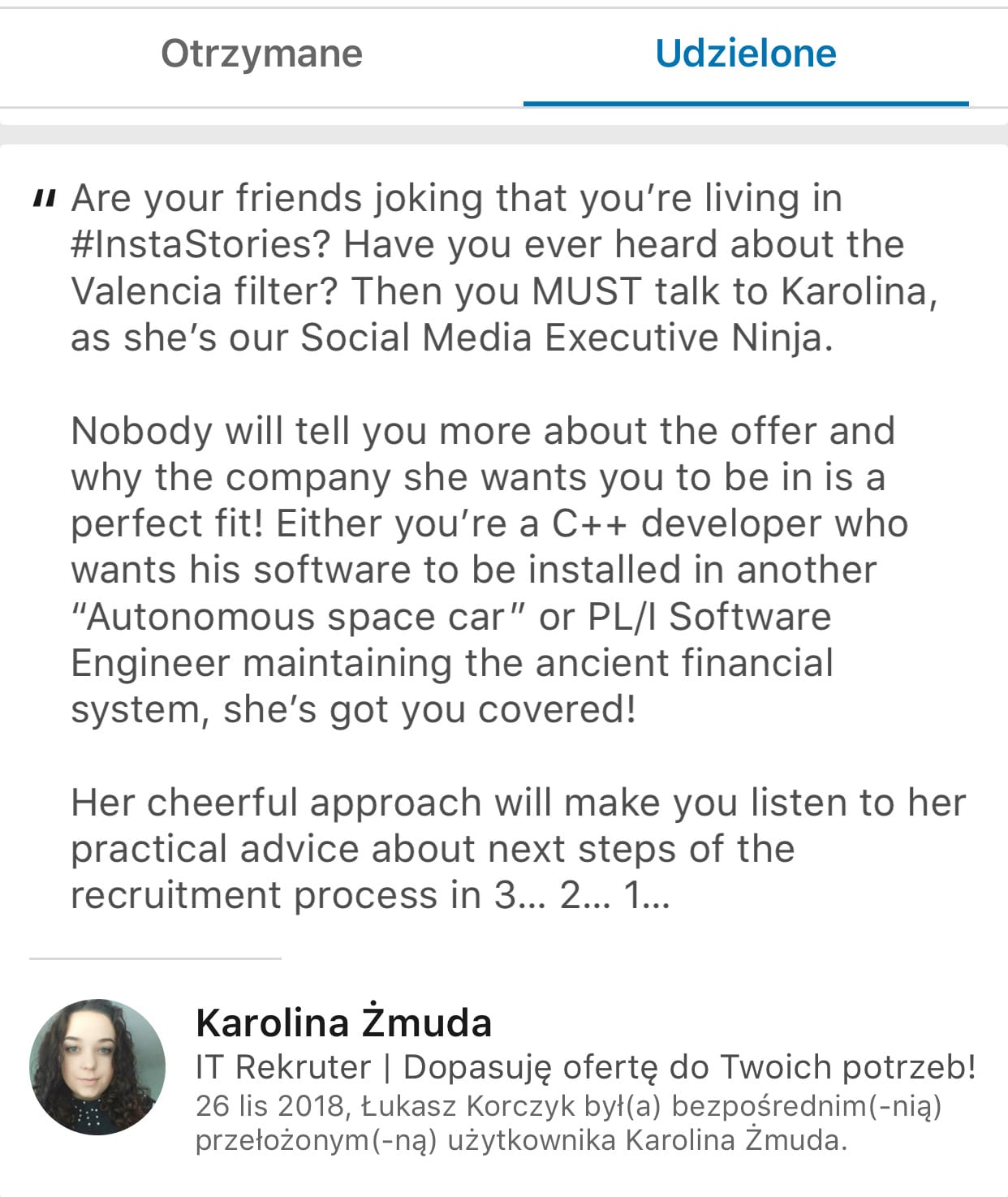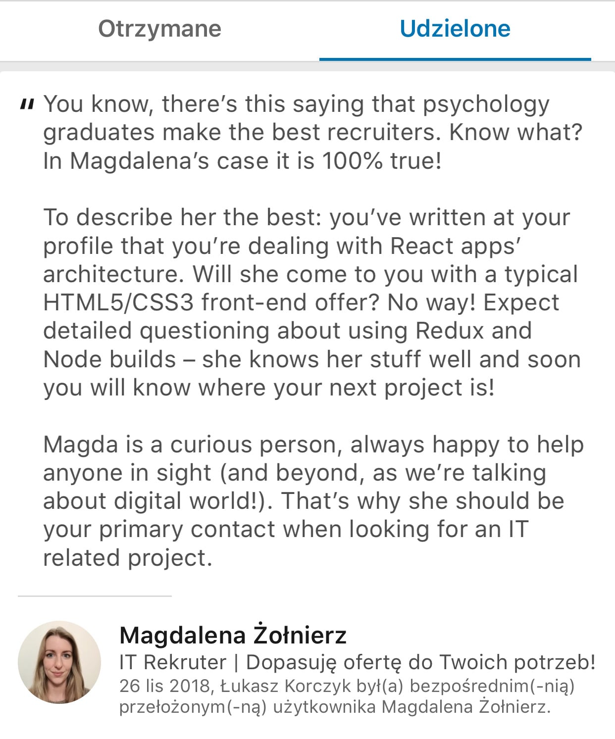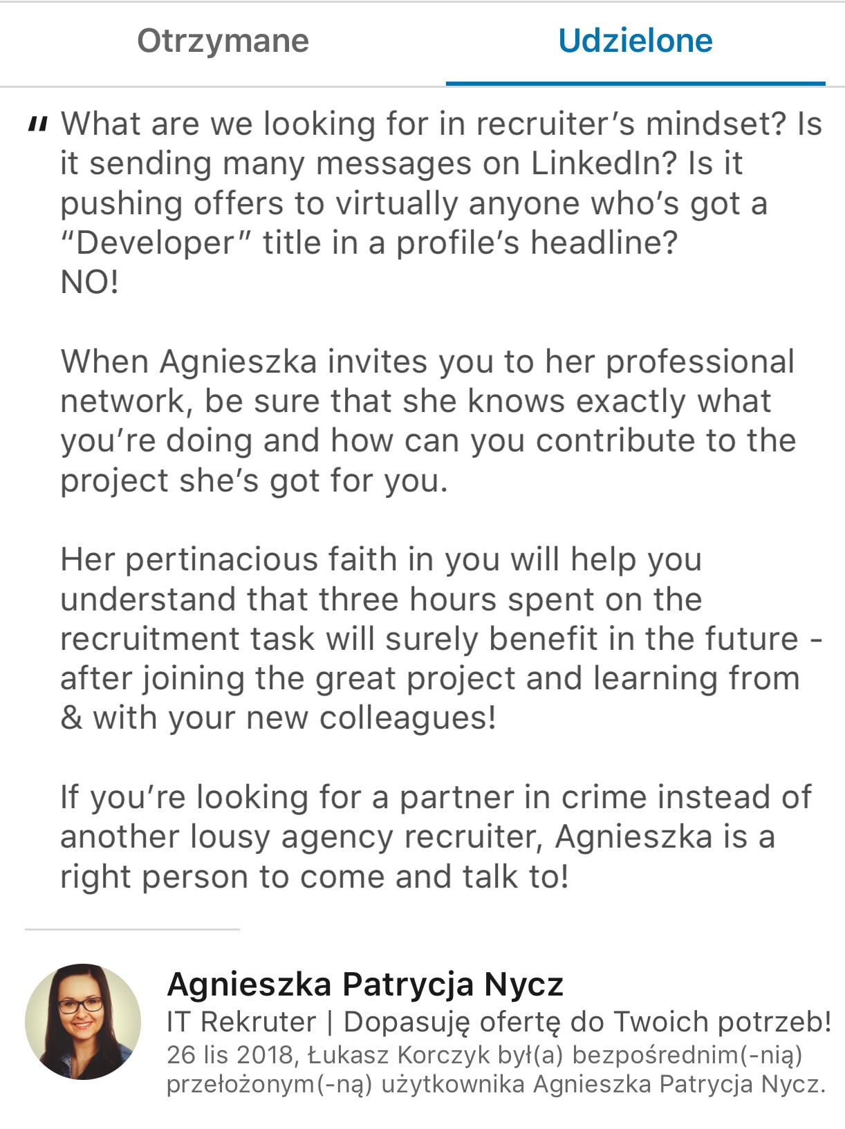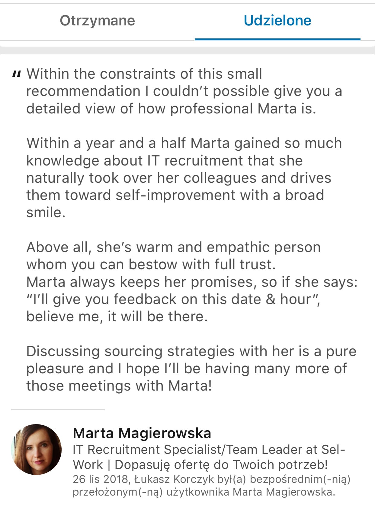 Te rekomendacje to z jednej strony podziękowanie za ciężką pracę dla członków zespołu, a z drugiej sposób na budowę jego marki osobistej. Jak zwraca uwagę Łukasz: