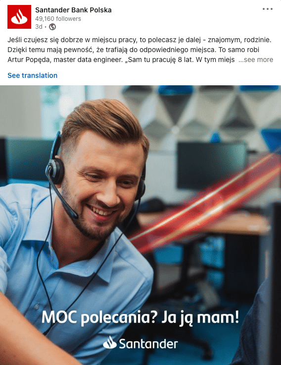 Firmowy profil Santandera to udany miks komunikacji employer brandingowej i korporacyjnej (ze szczególny naciskiem na tę pierwszą).