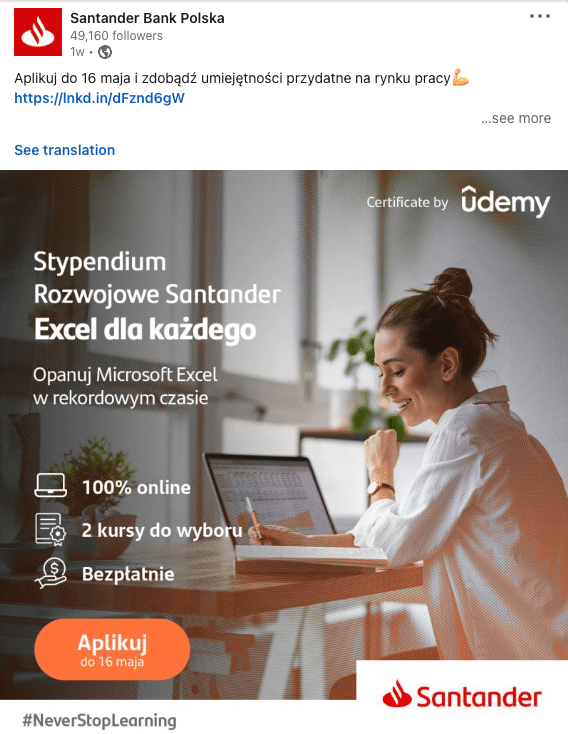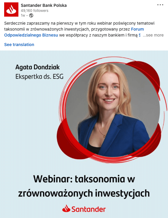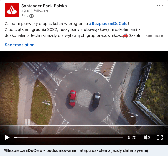 Znajdziemy tu mnóstwo treści firmowanych przez pracowników organizacji, zresztą bank jest jednym z pracodawców najprężniej działających w obszarze employee advocacy. Są regularne (to ważne!) odniesienia do trwających kampanii EB, inicjatyw wewnętrznych (jak szkolenia pracowników z bezpiecznej jazdy), są treści dla kandydatów (informacje o bezpłatnych kursach czy webinarach).