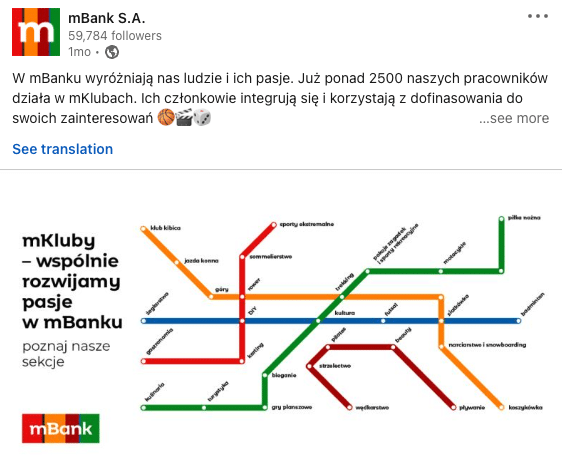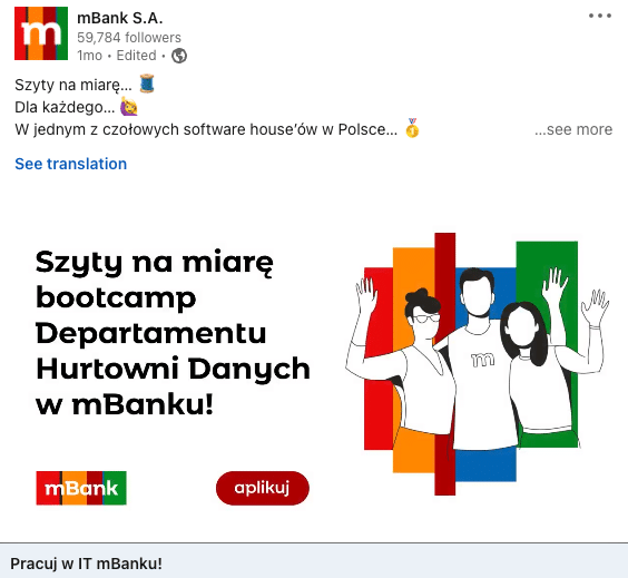 Na Linkedinowym profilu mBanku znajdziemy informacje o: