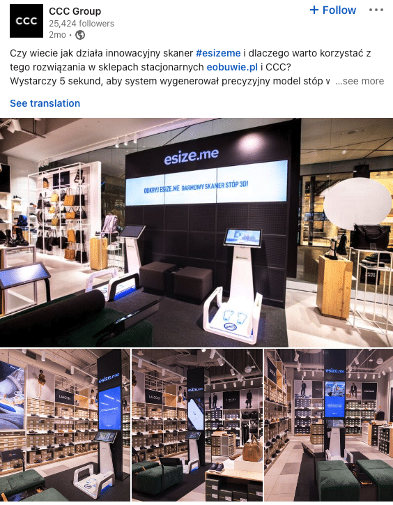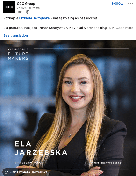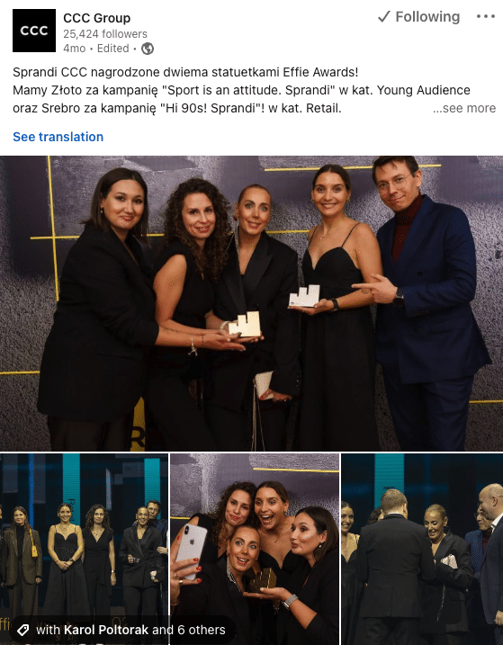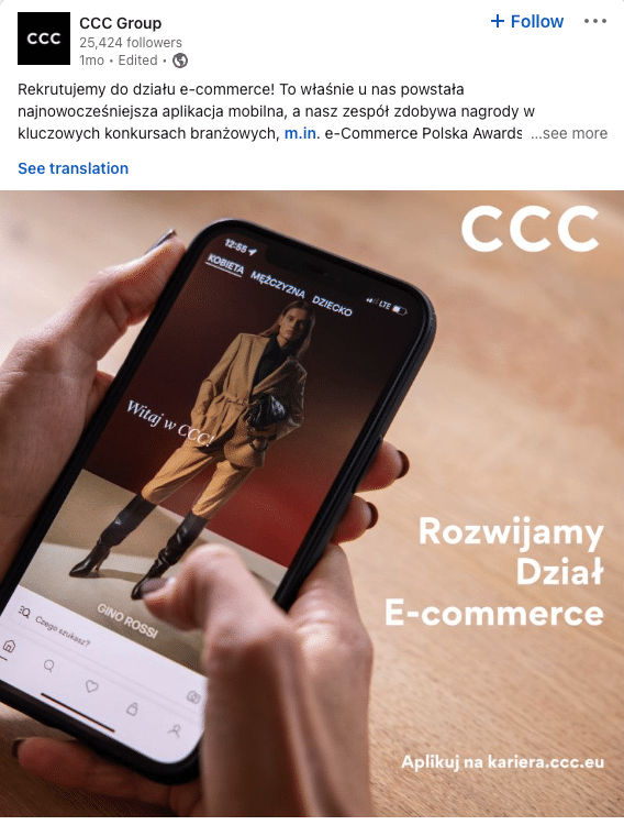 Czy pracodawca jest w stanie być na Linkedin codziennie? CCC pokazuje, że tak. W ciagu ostatnich 2 tygodni, firma opublikowała na swoim profilu firmowym 11 postów! Uwagę zwraca też duża liczba reakcji, komentarzy ale też udostępnień treści publikowanych przez firmę. CCC ekspertymentuje z przeplataniem treści typowo produktowych, z biznesowymi i EB-owymi. Udowadnia, że jest to do zrobienia.